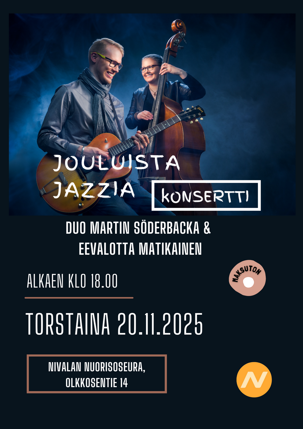 Kitaristi/laulaja Martin Söderbackan ja kontrabasisti Eevalotta Matikaisen Jouluinen jazzkonsertti kutsuu mukaansa joulutunnelmaan. Rakkaat suomalaiset joululaulut ja svengaavat amerikkalaiset…