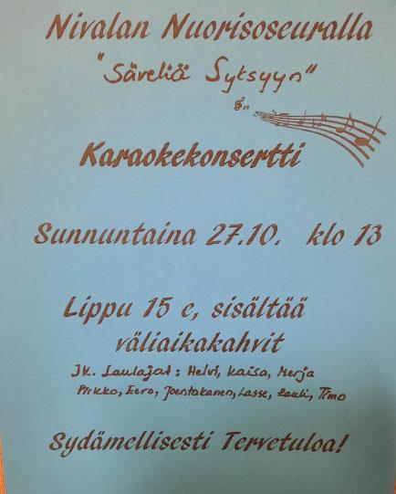 Tervetuloa viettämään sunnuntai-iltapäivää hyvän musiikin parissa. Konsertissa esiintyvät nuorisoseuran karaokelaulajat. Lipun hinta 15 €, johon sisältyy väliaikakahvit.