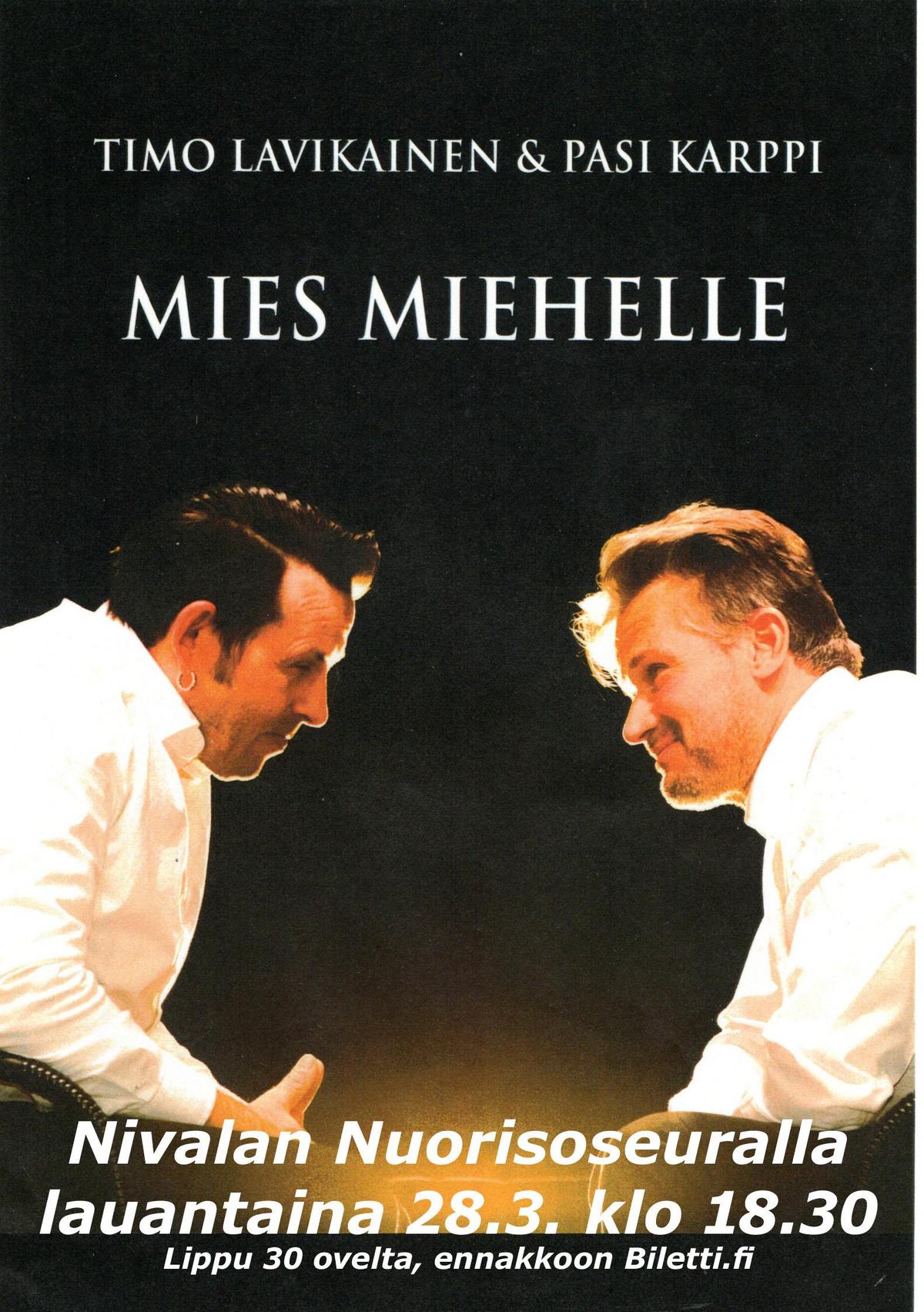 Timo Lavikainen & Pasi Karppi Mies Miehelle -esitys saapuu Nivalan Nuorisoseuralle.