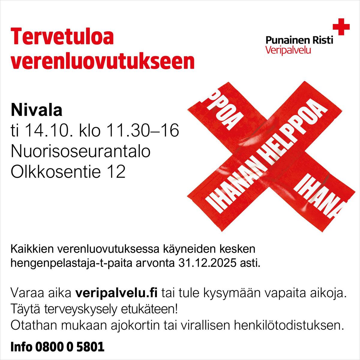 Tervetuloa tekemään hyvää! Tämän vuoden viimeinen verenluovutustilaisuus Nuorisoseuralla. Voit osallistua arvontaan ja nauttia hyvistä tarjoiluista kiitokseksi avustasi!